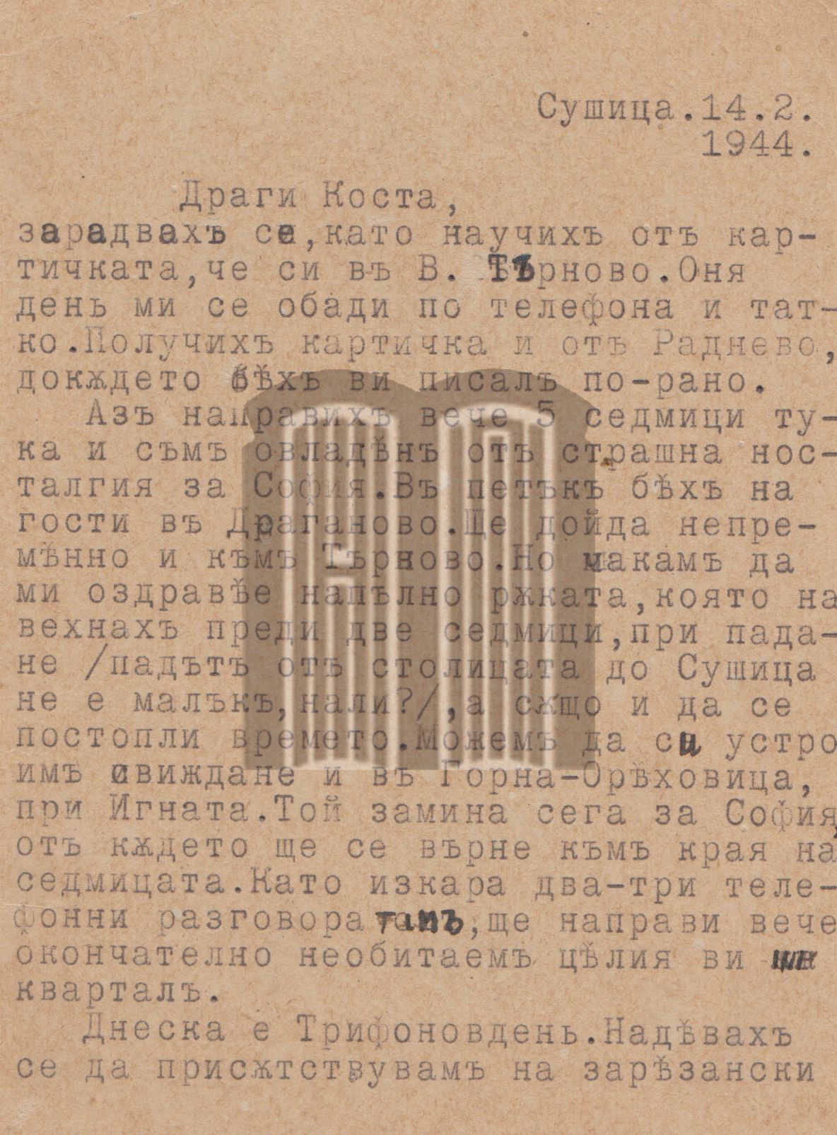 Пощенска картичка от Асен Разцветников до Константин Петканов. Село Сушица, 14. 02. 1944 г.