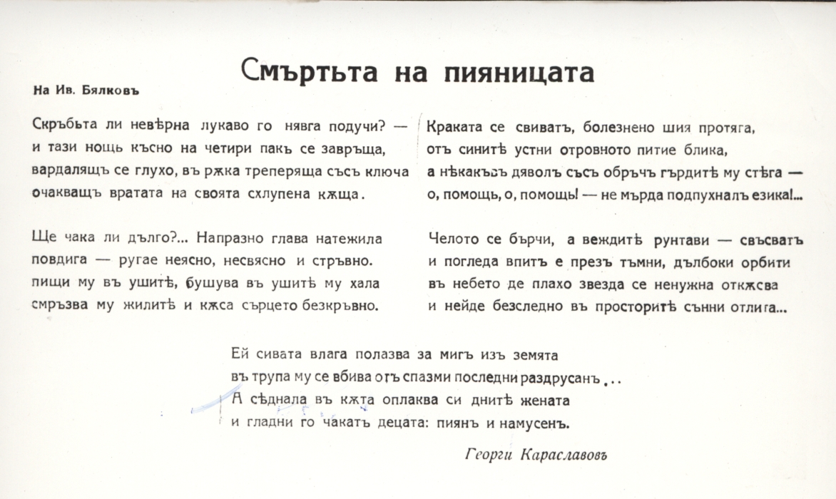 Стихотворението "Смъртта на пияницата" от Георги Караславов / Снимка