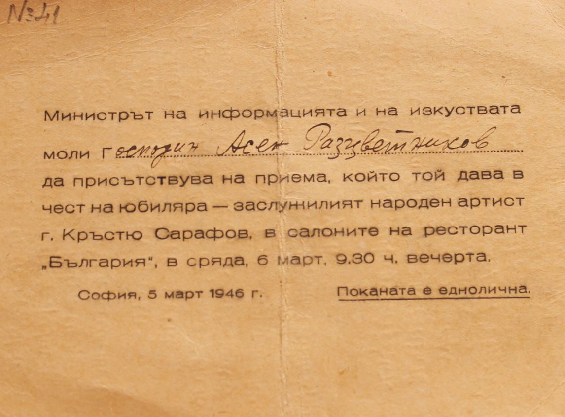 Покана до Асен Разцветников да присъства на приема в чест на Кръстю Сарафов / Покана