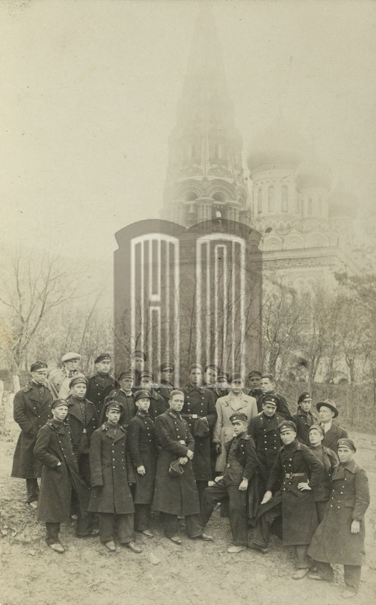 Антон Попов(в центъра на последната редица, с фуражка – вижда се лицето), като ученик в гимназията в / Групова снимка / Снимка