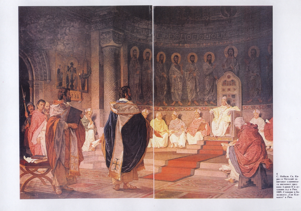 Св. св. Кирил и Методий защитават славянската писменост пред папа Адриан II и духовния съд в Рим¶ / Стенопис в базиликата "Сан Клементе" в Рим (1889) / Снимка