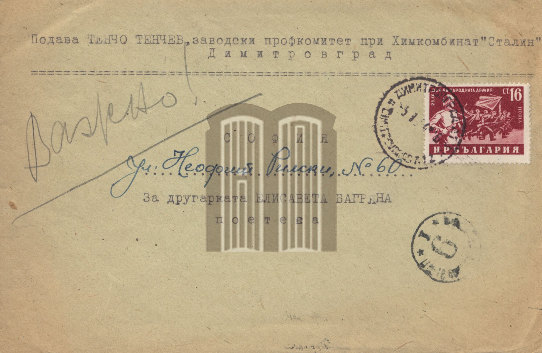 Анотация: Писмо от Тенчо Тенчев до Елисавета Багряна. Поздравява я с новата 1953 г. и я моли да му изпрати стихосбирките си "Вечната и святата", "Звезда на моряка" и "Пет звезди". Димитровград, 5 януари 1953 г.