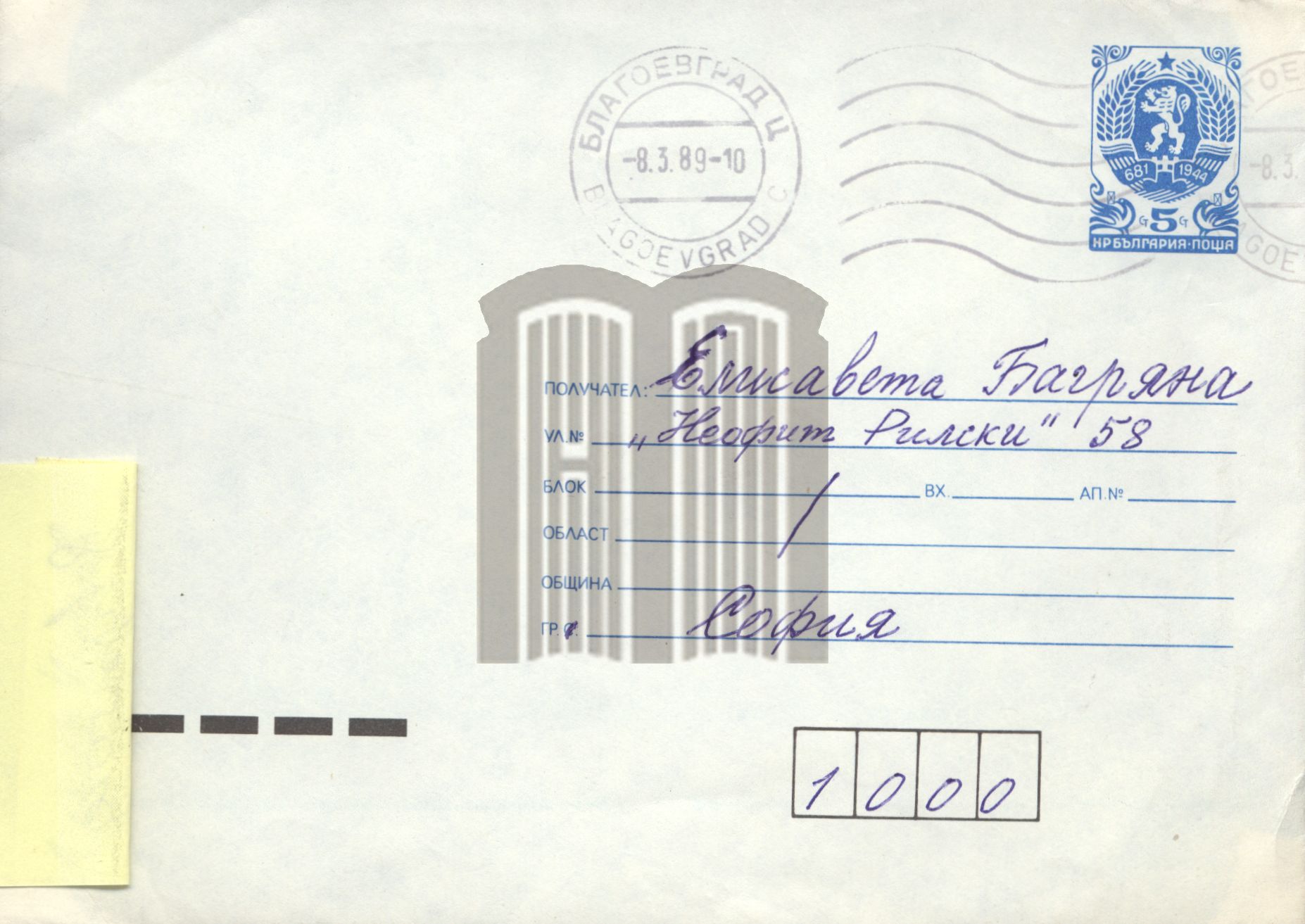 Илюстрована картичка от Илия Куков до Елисавета Багряна. Поздравява я за 8-и март. Благоевград, 8 март 1989 г.