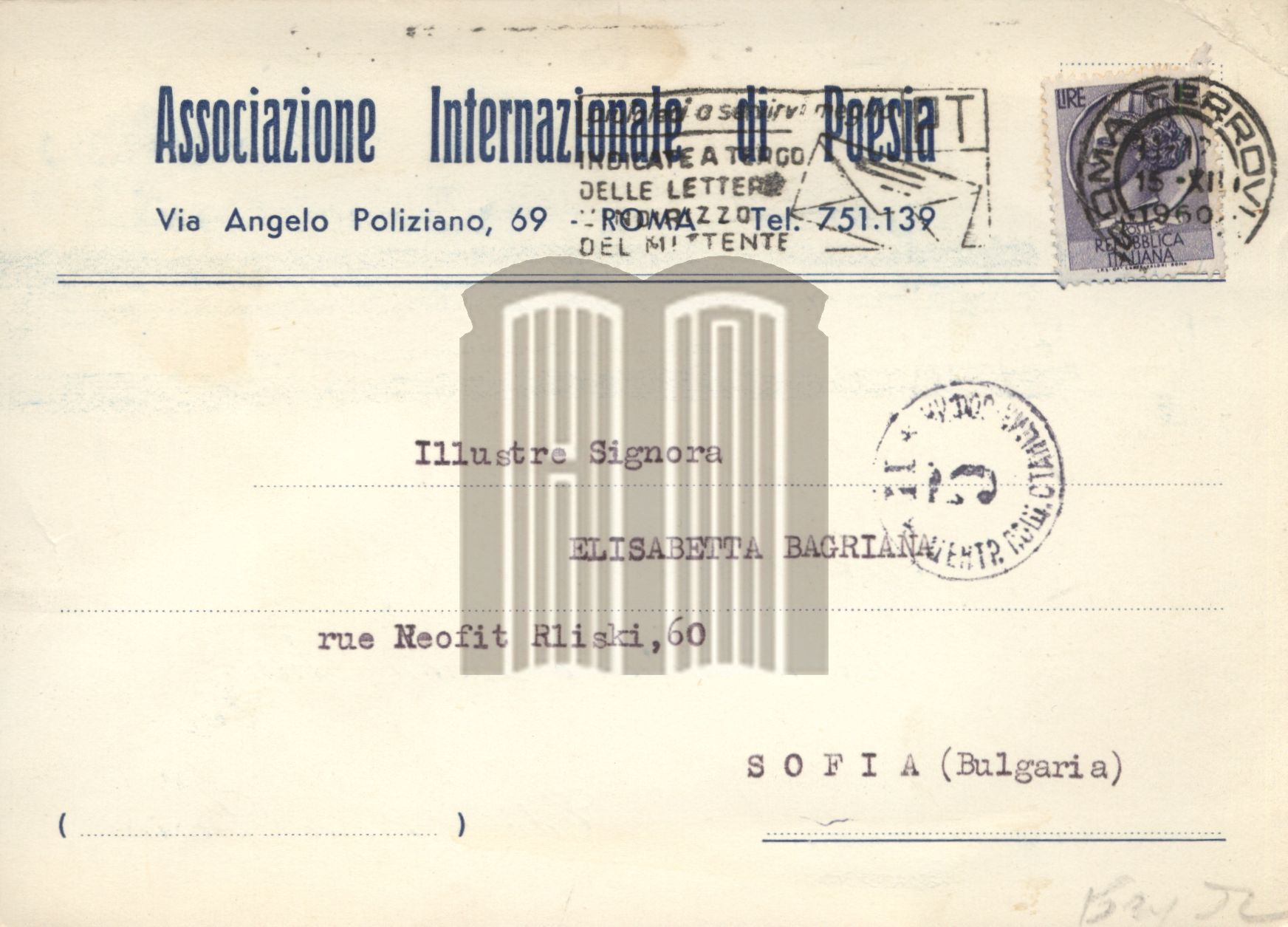 Покана от Е. П. Горини до Елисавета Багряна, на италиански ез.